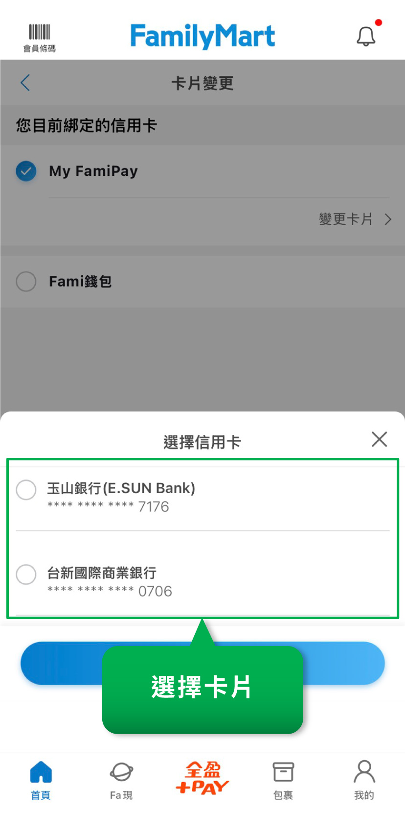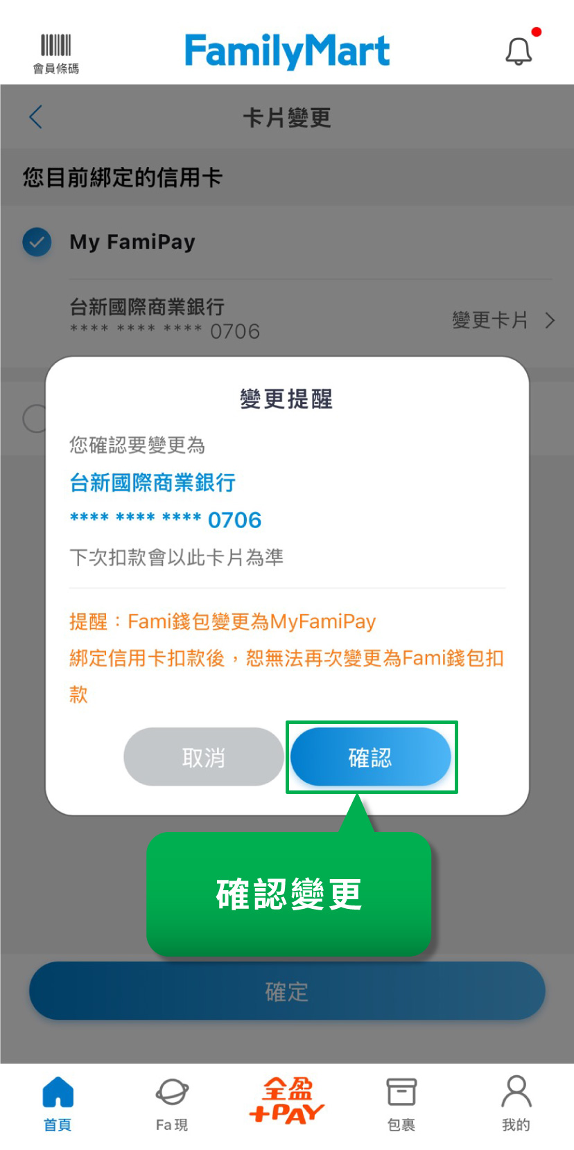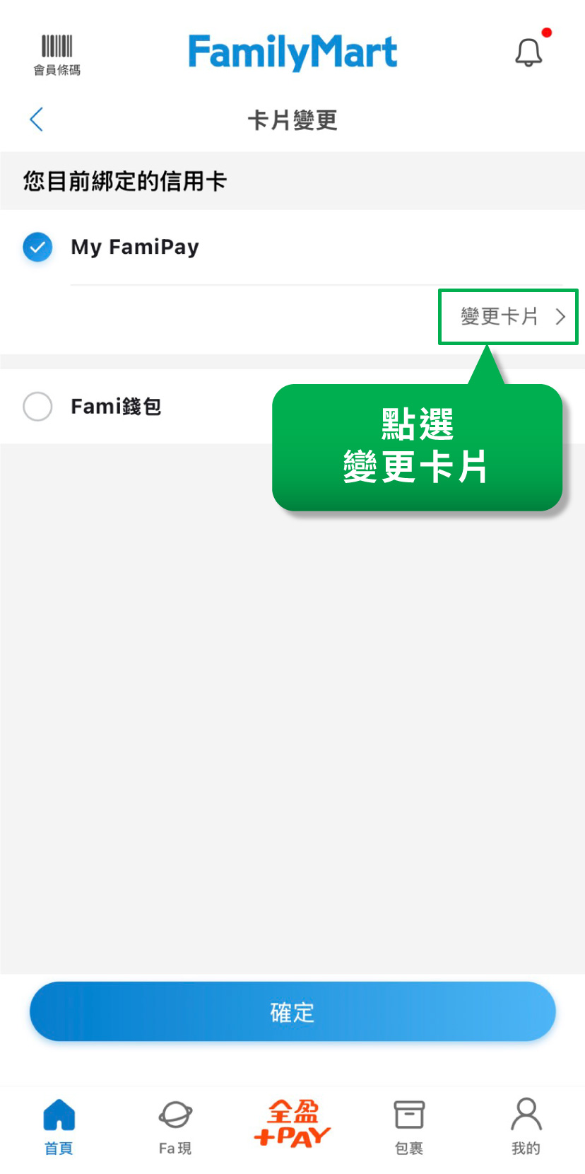 提醒:Fami錢包亦可於「變更卡片」功能變更為MyFamiPay扣款。使用MyFamiPay訂閱者,無法變更為Fami錢包扣款。